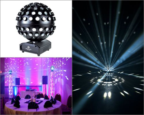 Speilkulene kommer med 1 spot som lyser mot den, og man kan også benytte roterende fargefilter hvis man vil at den skifter farge.