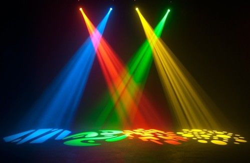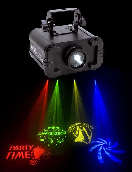Gobo prosjektor med 4 ferdige skiver som enkelt kan skiftes ut. Man kan også sette på forskjellige fargefilter hvis man ønsker det.