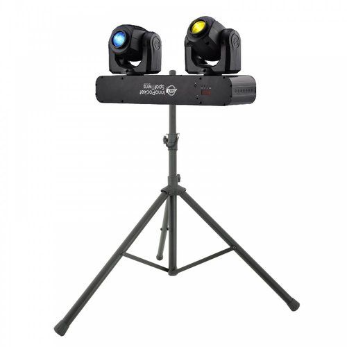 Leveres i flight, 2 stk dobble moving head, med trådløs fjernkontroll, 2x10 meter DMX kabel og 2 stk stativer.